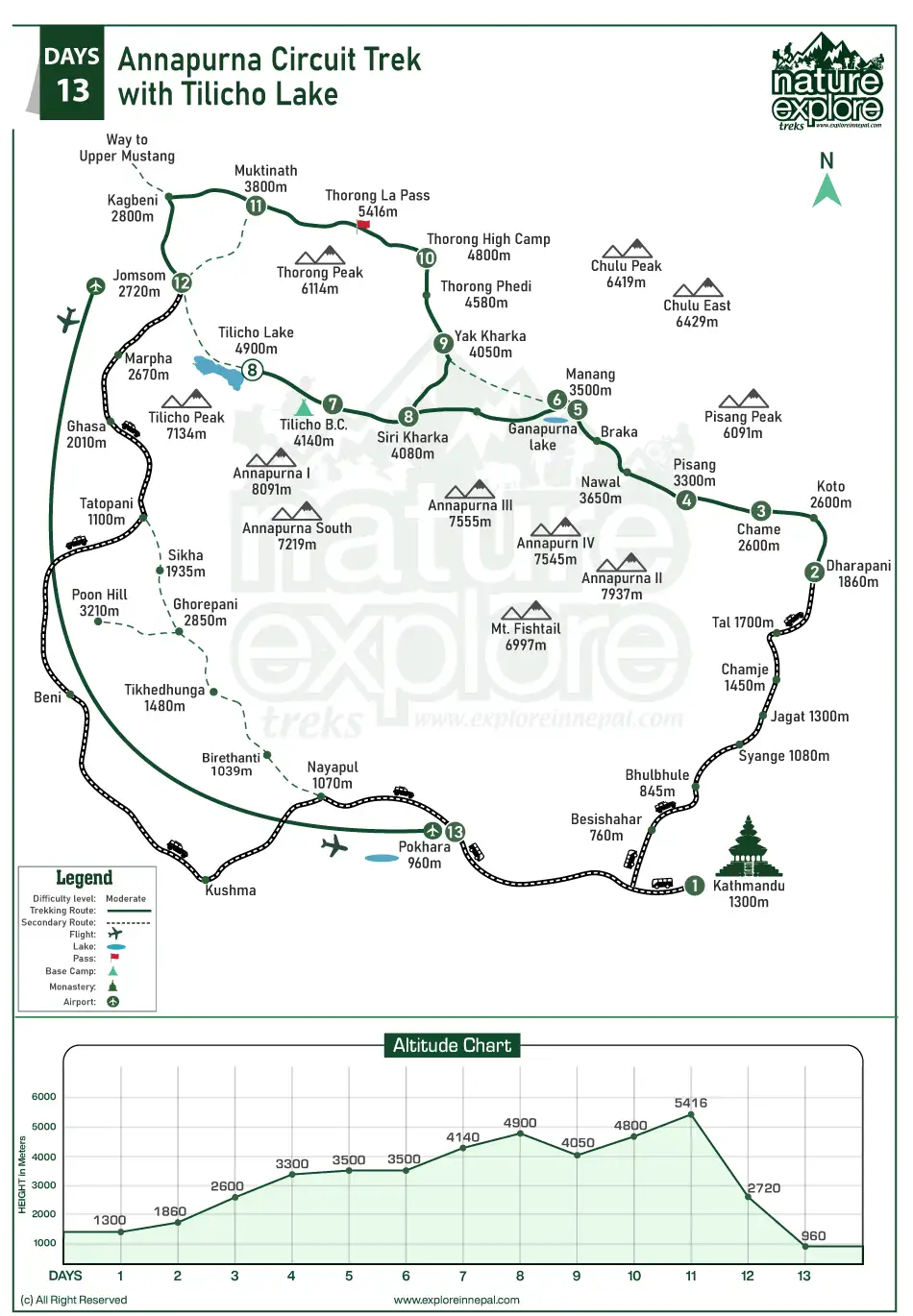 The Annapurna Circuit with Tilicho Lake trek is challenging trek as this trek combines the diverse terrain,varied altitudes and trekkers have to hike for like 6-7 hrs daily.The trek reaches high altitude,including Thorong La Pass at 5,416m and Tilicho Lake at around 4,919m so,proper acclimatization is essential to this trek to avoid altitude sickness.The trails for the trek varies from steep ascents to descents,rocky paths and high mountain passes concluding trekkers should have the good physical fitness .