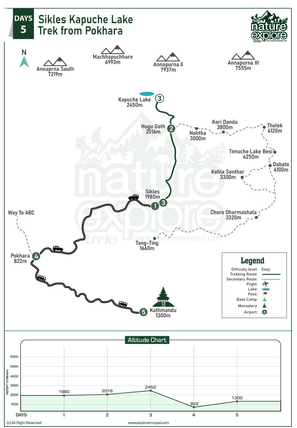 Trekking to Sikless Kapuche lake from Pokhara is a good option, especially if it is your first trek, since it is not difficult. Nevertheless, it is more comfortable to have some preparation before the journey. Light pack only, with warm clothes. The weather may fluctuate between Pokhara at 822 m / 2,696 ft and Kapuche Lake at 2,450 m / 8,038 ft, particularly during the mornings and evenings.