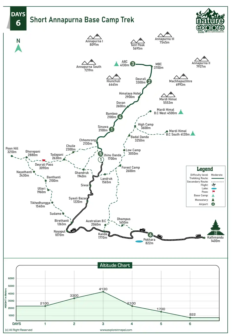 Короткий базовий табір Аннапурни вважається трекінгом середнього рівня складності, що підходить для трекерів з помірним рівнем фізичної підготовки. Трек включає в себе змішаний рельєф, включаючи поступові підйоми та спуски, тоді як спуск включає кам'янисті стежки, кам'яні сходи та лісові стежки. Трек виведе вас на висоту 4,130 м (13,550 фута) а сам похід зазвичай передбачає кількагодинну ходьбу, що може бути фізично виснажливим.